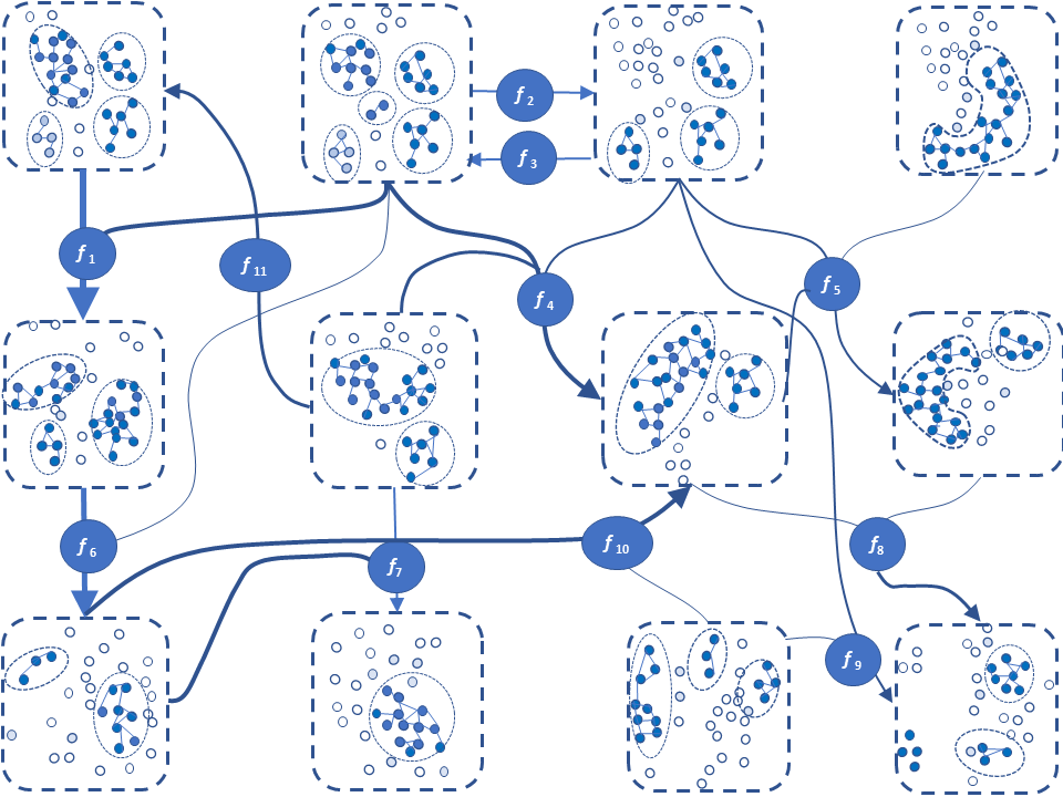 Now suppose we have multiple worlds, such as domains of sciences and businesses. Each domain has a value of Hg, corresponding to the variety of beliefs of belonging experts. Let us assume a network of connections, corresponding to interdisciplinary communication among these domains as in the figure above. In each domain shown as a cell in a dotted closed curve, the variety of contexts (interests if each node represents a word or a product) is quantified by Hg. Via the connections, the changes in Hg propagate and the domains in the network change the state of belief mutually. Thus, by learning the weight (as in NN) of each connection represented by an arrow, we can expect to simulate future trends of sciences and businesses by detecting the outstanding changes simulated.